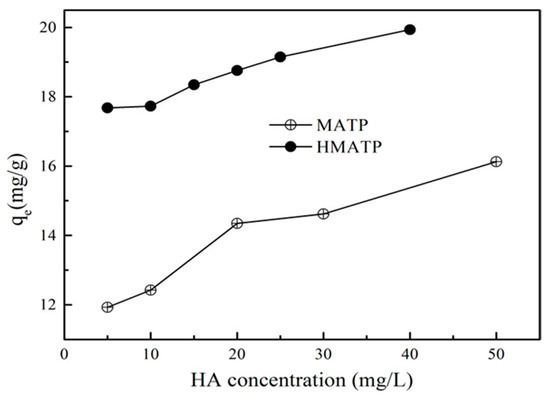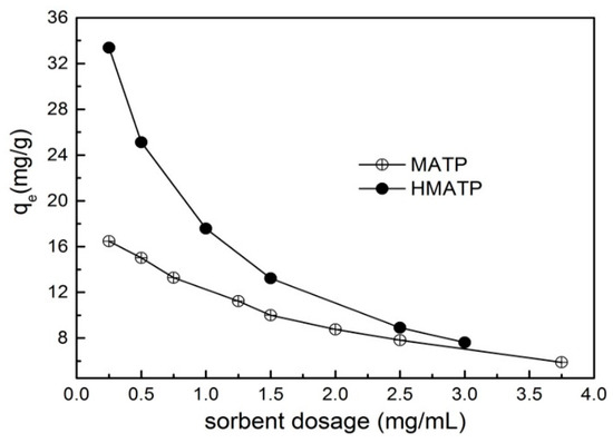 The relation curves between sorbent dosage and the sorption capacity are exhibited in Figure 9. It can be seen that the sorption capacities of propranolol on both MATP and HMATP decline with the increase in sorbent amount. With the increase of sorbent dosage, the sorption capacity of propranolol becomes less and less on unit sorbent dosage. In addition, the sorption capacity and the decrease rate of sorption capacity of HMATP are higher than those of MATP, which indicates that HA takes part in the propranolol sorption process.