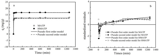 The corresponding fitting results and the kinetics parameters are shown and listed in Figure 12 and Table 2, respectively. As shown in Figure 12a, the fitted curves of the pseudo-first-order kinetics and the pseudo-second-order kinetics are close to the experimental data. However, the R2 of the pseudo-first-order kinetics for MATP in Table 2 is slightly higher than that of the pseudo-second-order kinetics, which indicates that the pseudo-first-order kinetics is more in line with the experimental data than the pseudo-second-order kinetics. R2 of two models for HMATP is the same, which may be ascribed to the loading of HA. A residual plot for each set of data was drawn to further analyze the goodness of fit (Figure 12b). For MATP, the difference between the standardized residual distributions of the two fits is small. In contrast, for HMATP, the residual distribution of pseudo-second-order kinetics is closer to zero. Therefore, it is reasonable to infer that MATP is more in line with the pseudo-first-order kinetic equation and HMATP is fitted with the pseudo-second-order kinetic equation.