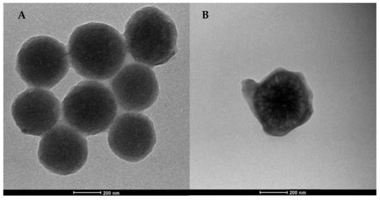 After the functionalization with PLA (Figure 3), the nanoparticles showed similar morphologies and sizes of bare NPs. However, both PLA/SiO2_s (Figure 3A) and PLA/SiO2_w (Figure 3B) nanoparticles appeared to be composed of a dense dark silica core and a gray contrast halo, indicating the presence of a less dense component due to the presence of PLA. Furthermore, hierarchical wrinkled architecture can hardly be appreciated in Figure 3B, suggesting that the polymer phase filled the pores of nanoparticles.