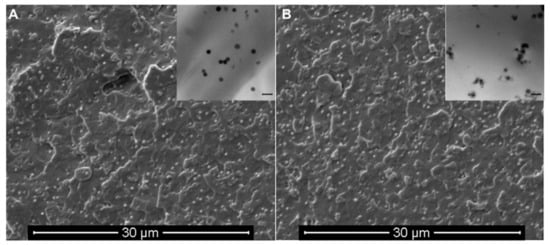 Both smooth and wrinkled nanoparticles appear homogeneously dispersed in the polymeric matrix, as highlighted from the SEM micrographs (Figure 4) of PLA/SiO2_s (Figure 4A) and PLA/SiO2_w (Figure 4B) nanocomposites. The corresponding TEM images of ultra-thin sections of both nanocomposites at low magnification, reported as inserts of Figure 4, indicated the achievement of an almost similar dispersion regardless of the type of nanoparticles included.
