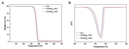 Figure 5A reports the thermogravimetric (TG) analysis of pure PLA, PLA/SiO2_s and PLA/SiO2_w nanocomposites. The TG curves show similar profiles of one step degradation at about 350 °C due to the thermal decomposition of pure PLA.