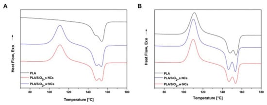 DSC curves of the first (A) and second (B) heating of pure PLA and PLA/SiO2_s and PLA/SiO2_w nanocomposites.