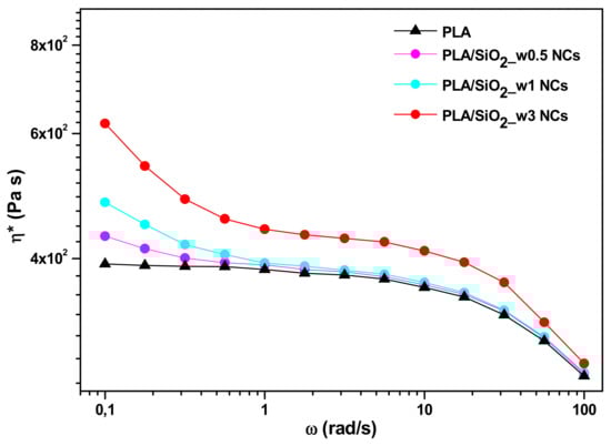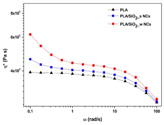 Complex viscosity of pure PLA and PLA/SiO2_s and PLA/SiO2_w nanocomposites.