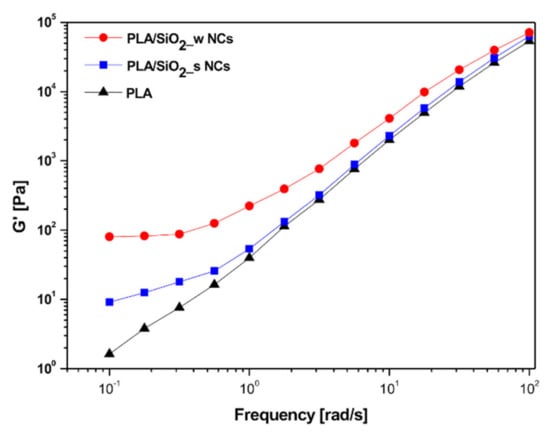 Storage modulus G’ of pure PLA and PLA/SiO2_s and PLA/SiO2_w nanocomposites.