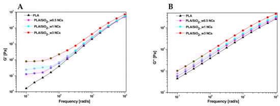 Nanocomposites with different amounts of wrinkle nanoparticles (0.5, 1 wt%) were also produced in order to assess the lowest filler amount allowing for significant enhancements in dynamical rheological properties. Representative curves of the storage modulus (G’) and loss modulus (G”) versus frequency (ω) are shown in Figure 10 for PLA based materials including various contents of wrinkled SiO2 nanoparticles. In particular, regarding G’ (Figure 10A), the liquid-like trend of the neat PLA fades at low frequencies where the slope of the curve progressively decreases up to the achievement of a plateau, as the filler content increases. When G’ is independent of the oscillation frequency (solid-like behaviour), the corresponding filler content represents the so-called rheological percolation threshold for the system under examination. On the other hand, at high frequencies (≥1 rad/s), although the presence of the filler translates the curves of G’ proportionally upwards with respect to that of the pure matrix, no variations in the slopes of the curves occur. In this region, the viscoelastic flow of the matrix becomes predominant with respect to the filler–matrix and filler–filler interactions responsible for the liquid–solid like transition described above.