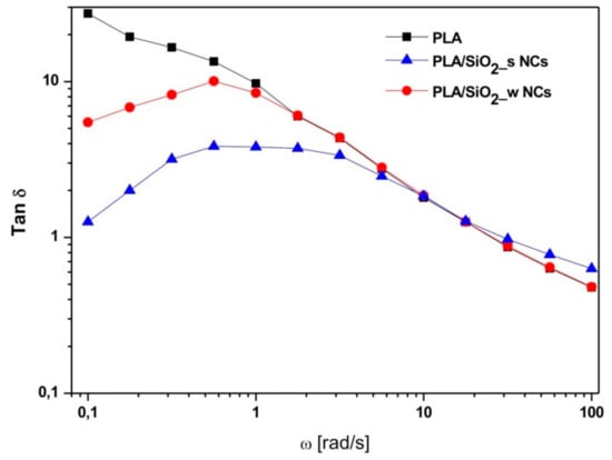 Loss factor tan δ of pure PLA and PLA/SiO2_s and PLA/SiO2_w nanocomposites.