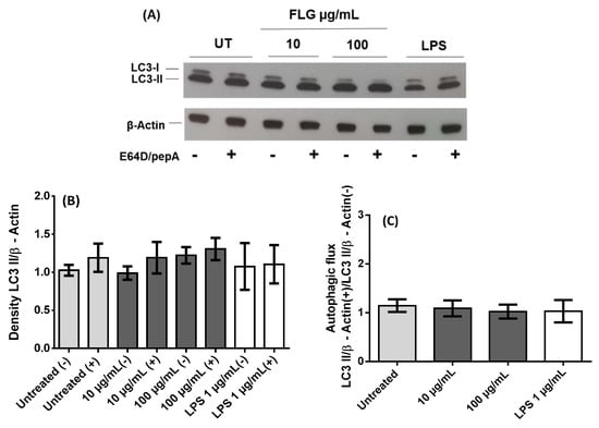 To evaluate autophagic activity, whole-cell proteins were extracted from macrophages treated with low (10 µg/mL) and high (100 µg/mL) concentrations of FLG for 24 h along with untreated and LPS-treated cells using Laemmli buffer (Tris-HCl 125 mM pH 6.8, 2% (w/v) sodium dodecyl sulfate (SDS); 10% (v/v) glycerol; 5% (v/v) β-mercaptoethanol). Cell lysates were separated on a 4–20% gradient gel (Biorad, Schiltigheim, France) and then transferred onto a polyvinylidene difluoride (PVDF) membrane. Cell membranes were blocked with PBS containing 0.1% (v/v) Tween 20 (PBS-T) and 5% (w/w) non-fat dry milk for 1 h and incubated 50 min at 4 °C with a 1 µg/mL anti-LC3 antibody in PBS-T containing 5% non-fat dry milk. The antibodies used for western immunoblotting were specific for the LC3 autophagic marker (MBL, clone 51-11, #M115-3) and the β-actin loading control (C4 mouse monoclonal antibody, Santa Cruz Biotechnology, #47778). After washing with PBS-T, the membranes were incubated for 30 min at room temperature with goat anti-mouse IgG antibody (Southern Biotech, Birmingham, Alabama, #1030-05) conjugated to horseradish peroxidase (HRP). The signal was detected using enhanced chemiluminescence detection reagents (Immobilon Western, Merck Millipore, Darmstadt, Germany, #WBKLS0500) and visualized on radiographic film in a Kodak processor (#M35-M X-OMAT, Rochester, NY, USA).