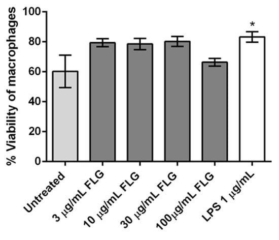 Flow cytometry analysis of cellular viability of BMDMs treated with different concentrations of FLG (3, 10, 30 and 100 µg/mL), with LPS (1 µg/mL) and left untreated, for 24 h. One-way ANOVA followed by Bonferroni’s test was performed to determine the statistical differences among samples versus control untreated cells (* p < 0.05).