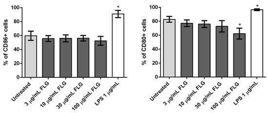 Flow cytometry analysis of CD86 (left) and CD80 (right) expression in BMDMs left untreated as a control or treated with different concentrations of FLG (3, 10, 30 and 100 µg/mL) or with LPS (1 µg/mL), for 24 h. %CD86 and %CD80 refer to the percentage of live gated cells that express CD86 or CD80 respectively. A One-way ANOVA followed by Bonferroni’s post-test was performed to determine the statistical differences for control untreated cells versus FLG-treated samples and LPS-treated cells (* p < 0.05).