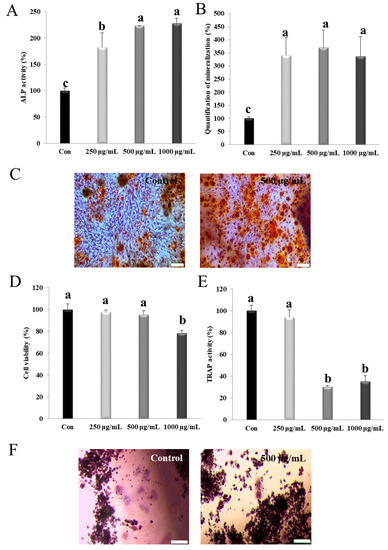 MG-63 (5 × 104 cells/mL) and RAW 264.7 (5 × 104 cells/mL) cells were differentiated in a 96-well plate. The cell viability was determined by 3-(4,5-dimethylthiazol-2-yl)-2,5-diphenyltetrazolium bromide (MTT; Promega, Madison, WI, USA) analysis. The cells were treated with various concentrations (250–1000 μg/mL) of NM for 24 h. After 24 h of exposure, the 20 µL of MTT solution (5 mg/mL) was added. After 4 h, the formazan crystals had formed and dissolved in 200 µL of dimethyl sulfoxide (DMSO). Then, the absorbance of the resulting solution was evaluated based on the optical density values measured at 540 nm using a microplate reader (Biochrom Asys, Cambridge, UK).