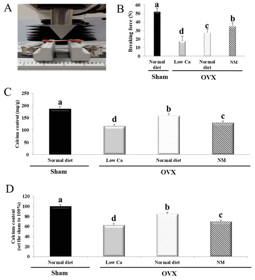 All animal experiments were performed with the approval from the Institutional Animal Care and Use Committee at Konkuk University (IACUC approval number KU 15133). Female Wistar rats weighing 117 ± 7 g and aged 5 weeks (Doo Yeol Biotech, Seoul, Korea) were used in this study. The animals were maintained in a room at 22 °C with a 12 h light-dark cycle. After acclimatization for one week, the rats were anesthetized with 2% isoflurane, and their ovaries were removed bilaterally. Rats underwent a sham operation (n = 12), by exposing ovaries without excision, or ovariectomy (OVX, n = 36), by ligating and excising the ovaries. After a 2-week acclimation period, the sham and normal diet groups were fed a normal (0.6% Ca) diet (TD.97191), while the other groups were fed a low-Ca (0.01%) diet (TD.95027). The animals were randomly divided into four groups (12 rats per group): (1) Sham (normal diet); (2) low-Ca (OVX + low-Ca); (3) normal diet (OVX + normal diet); and (4) NM (OVX + low-Ca + 50 mg/kg NM) (Table S1). The dietary supplement composition is shown in the Supplementary Material (Table S1). The food intake was monitored daily, and the rats were weighed once weekly. The rats were dosed 50 mg NM/kg body weight via drinking water ad libitum. At the end of the 8-week feeding period, the rats were dissected. Blood samples were collected from the heart while the animal was lightly anaesthetized, and serum was separated by centrifugation (848 g for 30 min) and then stored at −80 °C prior to the biochemical analyses. Tibial bones were dissected and stored at −80 °C.