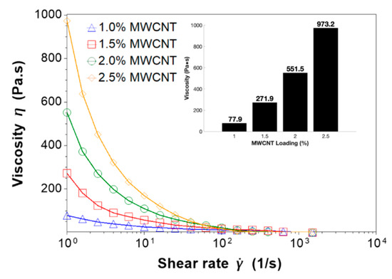 Rheology tests were performed on the nanocomposite prepolymer to determine the reinforcement effects of MWCNT loadings between 1.0 wt. % and 2.5 wt. %. The viscosity of the nanocomposite prepolymer contributed significantly to the formation of the pores during the microwave-curing procedure. Therefore, it was necessary to investigate the viscosities of the uncured resin at the MWCNT loadings explored in this study.