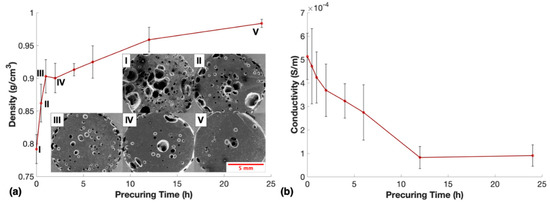 The variation of the measured density indicated that the precuring time was an important parameter to consider when using one-step microwave irradiation to fabricate these porous nanocomposites. To take advantage of the closed-cell porosity to improve piezoresistive performance, ideally, the pores would be consistently small and evenly dispersed throughout the sensor. This is not the case for samples cured after less than one hour of precuring (Figure 3aI, II), as the SEM images show very large amorphous pores unevenly distributed throughout the nanocomposite. Large pores that were not evenly distributed caused large variation in piezoresistive and mechanical behavior during cyclic compressive loading tests. These large pores did not collapse fully until a significant strain was applied to the sensor, which resulted in low piezoresistive sensitivity at small strains and inconsistence in resistance change at larger strains. Therefore, a larger number of smaller well-distributed pores were desirable for the enhanced piezoresistive performance of the nanocomposites as the complete collapse of smaller pores occurred at lower strains and the resulting change of conductive networks were more uniform and repeatable. To determine what impact the precuring time before microwave exposure had on the electrical properties of the material, conductivity tests were performed on all samples fabricated for this study, as shown in Figure 3b.