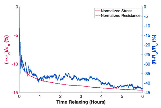 The long-term piezoresistive and stress relaxation behavior of the nanocomposite held under compressive strain was characterized. The 2.5 wt. % microwave-cured nanocomposite was compressed to a maximum strain of 10% and held for 6 h while recording mechanical and electrical data. The results of this test are shown in Figure 9. Notably, the stress and resistance signals shown depict the data recorded after 10% strain was applied. The results indicated that the majority of the piezoresistive and stress relaxation behavior demonstrated by the nanocomposite took place within the first hour. The measured rate of stress relaxation agreed well with the reduction of the measured resistance change of the nanocomposite. This confirmed that the electrical networks formed by the MWCNTs within the PDMS matrix were dependent on the viscoelastic stress relaxation behavior of the matrix material. Small variations in the relative resistance change can be attributed to the saturation of the percolation networks of the 2.5 wt. % nanocomposite upon compression. Over a few hours, these electrical networks became progressively more stable indicative of increased stress stability within the matrix material.