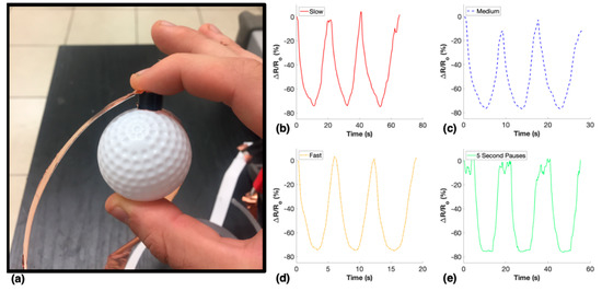The 2.5 wt. % porous nanocomposite was used in a compression sensing application to prove is viability as a flexible sensor that could be used in a variety of applications including skin attachable human motion detection, soft robotics, and prostheses. The piezoresistive sensor was placed between two copper tape electrodes and the resistance of the nanocomposite was measured while compression was applied by squeezing a golf ball, as seen in Figure 10a. The golf ball was cyclically squeezed at four different rates and the relative change of resistance of the nanocomposite for each rate is shown in Figure 10b–e. Notably, the sensitivity of the sensor remained consistent throughout each test and did not display dependence of strain rate as the maximum strains and strain rates applied were unknown.