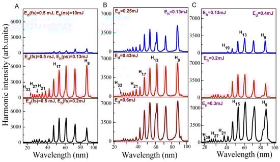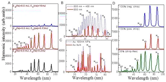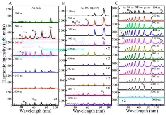 Figure 5A shows the harmonic spectra obtained from ablated Au bulk target using SCP of LPP and different heating laser pulse duration. The obtained harmonics were extended up to H33 in the case of shortest heating pulse duration. The harmonic cut off was decreased in the case of TCP (H23, Figure 5B) as compared to SCP (H31) due to application of shorter wavelength component of pumping radiation. The harmonic intensities obtained using TCP were two times stronger with regard to SCP (Figure 5B), despite of small conversion efficiency of second-harmonic radiation in BBO (~2.5%) and small ratio of 800 and 400 nm energies (1:40). It was suggested that TCP generates stronger harmonics because of the formation of quasi-linear field, selection of a short quantum path component, which has a denser electron wave packet, and higher ionization rate compared with SCP [45]. TCP generated broader harmonics with regard to SCP due to self-modulation of the driving pulses in the plasma area (Figure 5B). Figure 5C shows the harmonic spectra obtained from ablated Au bulk and Au 100 nm NPs using TCP geometry and ns heating pulses. One can see that ablated Au 100 nm NPs produced stronger harmonics as compared to ablated Au bulk target in two-color configuration as well.