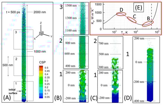 The result of 4.0 ps laser pulse interaction with gold at the incident fluence of Finc = 2 J cm−2 (λ = 800 nm) is shown in Figure 7C. Unlike the previous situation, here we observe the formation of large droplets of the material without noticeable contribution due to small clusters and free atoms shown in zone “2”. The process of foam formation due to spallation is seen in zone “1”. This time, since the pulse is longer, the laser intensity at the peak of the pulse is much lower as compared to the case of 0.3 ps pulse. The elevation of the electronic temperature therefore, is just 15,000 K, which corresponds to the scaling of electron conductivity function as ke ~ Te/Ti, and reflected in Figure 7E in the red rectangle by the marker C. Therefore, the deposited laser energy will efficiently penetrate the bulk of the material resulting in the establishment of temperature and pressure gradients by the time of the electron-phonon equilibrium on a spatial scale of ~200 nm.