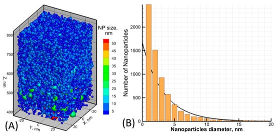 The NPs formed due to 0.3 ps laser pulse interaction with a thick Au target are shown for the area “2” in Figure 7B between 400 nm and 800 nm of the ablation plume (A). The NPs are colored and sized in accordance to their diameter value. The NPs size distribution for the same conditions is shown in (B). The exponential fit is applied for estimation of the NPs mean size of ~3–4 nm.