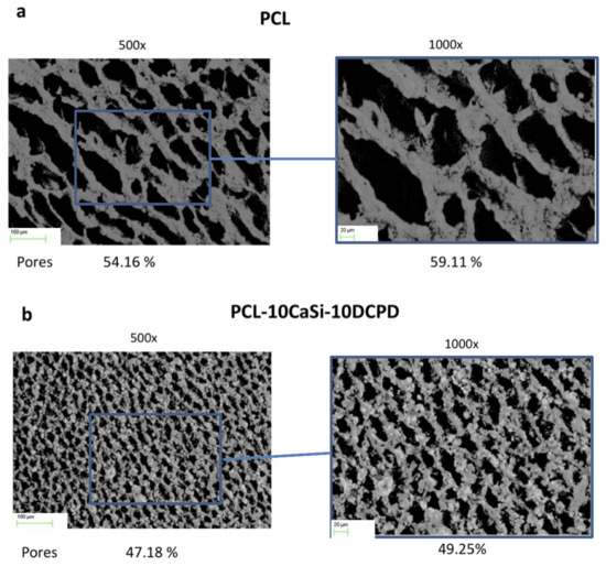 The mean value of surface porosity valuated at 500× and 1000× was 45.49% and 51.08 for PLA scaffolds (Figure 1a) and 31.51% and 26.94% for PLA-10CaSi-10DCPD scaffolds (Figure 1b).