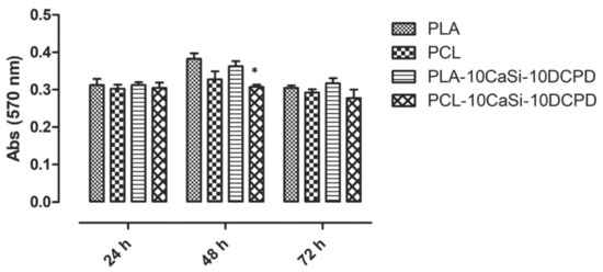In order to measure the metabolic activity of VW-MSCs grew on the scaffolds, a MTT based assay method was performed on cells 24, 48, and 72 h post seeding. The results showed that VW-MSCs maintain a metabolically active state when seeded on all the materials. After 48 h cells seeded on PLA and PLA-10CaSi-10DCPD showed higher metabolic activity compared to cells seeded on PCL or PCL-10CaSi-10DCPD (Figure 4).