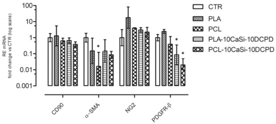 PLA and PCL scaffolds doped with CaSi and DCPD mineral fillers showed the expression of alpha-SMA whilst PCL scaffold (control) caused a reduction of alpha-SMA expression. The expression of α-SMA—the actin isoform typical of vascular smooth muscle cells [44]—indicates the angiogenic differentiation on the experimental scaffolds.