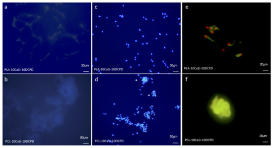 DAPI staining for PLA-10CaSi-10DCPD (a) and PCL-10CaSi-10DCPD (b) without cells and in the presence of 72 h cultured cells: PLA-10CaSi-10DCPD (c), PCL-10CaSi-10DCPD (d). Immunofluorescence analysis for alpha-tubulin of 72 h cultured cells on PLA-10CaSi-10DCPD (e) and PCL-10CaSi-10DCPD (f). Scale bar = 50 µm for a–d and 20 µm for e,f, *indicate spherical cluster.