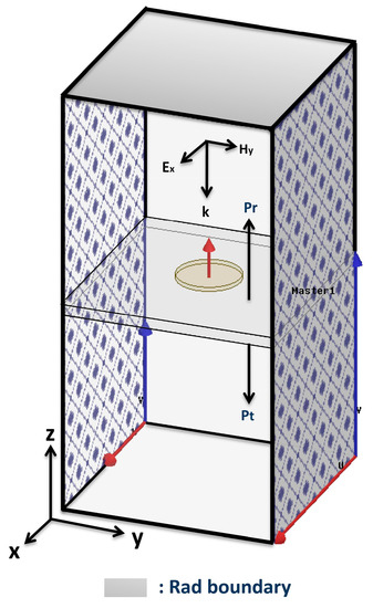 Schematic view of the circular nanodisk array simulation using a periodic boundary condition. Master and slave boundaries are used along the x–z and y–z planes, and the radiation boundaries are assigned on the top and bottom of the simulation boundary box.
