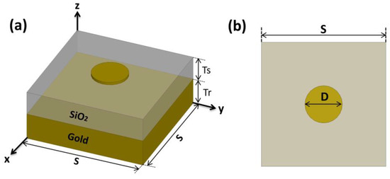 A single circular nanodisk was designed over a SiO2 grounded substrate in the radiation boundary. A schematic view of the design is shown in Figure 2. The thicknesses of the gold reflector (Tr) and disk, and the substrate size (S) were fixed at 200 nm, 10 nm, and 1.3 µm, respectively. An x-polarized plane wave (E0 = 1 V/m) was illuminated normally from above the structure, the electric field (E) 1 nm below the edge of the nanodisk was calculated, and E/E0 was used for a field enhancement factor [21,41]. To accurately calculate the field enhancement factor, a 10 nm × 10 nm × 10 nm SiO2 box enclosing the field calculation point was inserted, and mesh sizes smaller than 1 nm were used. With this simulation setup, we found that 235 nm for the disk diameter (D) and 40 nm for the SiO2 thickness (Ts) provided the maximum field enhancement at 230 THz.