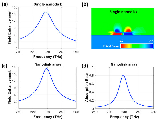 The performance of the single nanodisk and the nanodisk array on the grounded SiO2 substrate. (a) The electric field enhancement of the single nanodisk with a disk diameter (D) of 235 nm and a SiO2 thickness (Ts) of 40 nm. (b) The z component of the electric field distribution (Ez) in the x–z plane along the disk’s central axis. (c) The electric field enhancement and (d) the absorption rate of the nanodisk array with an antenna pitch size (P) of 1 µm.