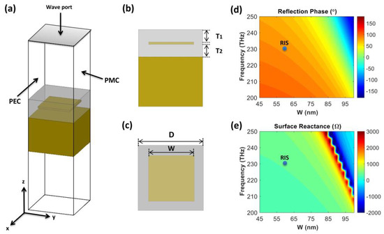 (a) Schematic view of the metallic patch unit cell with the perfect electric conductor (PEC) and perfect magnetic conductor (PMC) boundary conditions and wave port excitation. The integration line (x-direction) in the wave port is perpendicular to the PEC boundary and parallel to the PMC boundary. (b) Side view (y–z plane) with dimensions of T1 = T2 = 50 nm. (c) Top view (x–y plane) with the patch periodicity (D) and patch width (W). (d) Reflection phase and (e) surface reactance of the RIS as a function of patch width (W) and frequency (D = 125 nm).