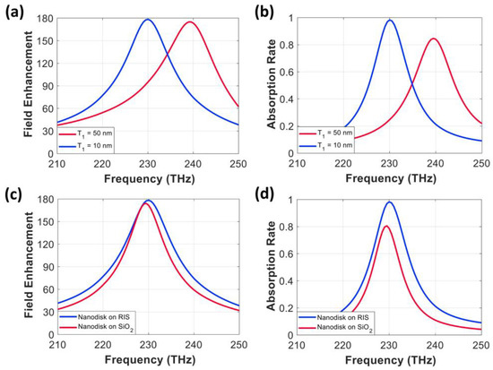 (a) Electric field enhancement and (b) absorption rate of the nanodisk arrays combined with the 60 nm wide RIS patch array with T1 = 50 nm and T1 = 10 nm for the SiO2 thickness on top of the RIS patch. Note that T2 is fixed with 50 nm. The performance comparison between the circular nanodisk on the RIS (T1 = 10 nm and T2 = 50 nm) and the grounded 40 nm thick SiO2 substrate in terms of (c) electric field enhancement and (d) absorption rate.