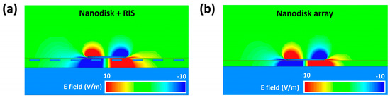 To understand the coupling mechanism between the nanodisk array and the RIS patch array, we calculated the z component of the electric field (Ez) in the x−z plane along the disk’s central axis. Figure 7a shows that the coupling between the LSPPs and the array diffraction was not disturbed due to the RIS patch array, and strong fields were maintained in a wider area between the disk and the reflector compared with the fields from the nanodisk array in Figure 7b. From this analysis, we concluded that the higher field enhancement and absorption rate from the nanodisk array combined with the RIS patch could be attributed to the strongly coupled field in a larger volume.