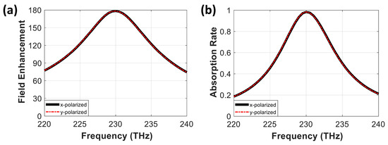 Demonstration of polarization independence of the proposed absorber. (a) Electric field enhancement and (b) absorption rate of the proposed absorber with different types of polarization. The solid black line and red dashed line represent x- and y-polarized incident waves, respectively.