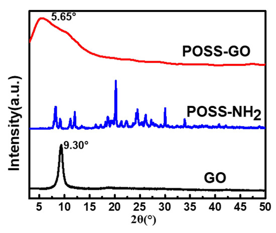 The successful functionalization of graphene oxide using POSS is vital in the interfacial reinforcement within the polymer matrix. Figure 2 displays the XRD patterns which substantiates the successful functionalization of GO using POSS. The POSS comprise of the amine groups attached on its surface. The XRD diffraction peak of GO is obtained at 2θ = 9.30°, corresponding to the inter layer spacing of 0.9250 nm. The XRD analysis of POSS-NH2 displays numerous diffraction peaks at different angles, depicting its crystalline structure. The XRD diffraction peak of POSS-GO furnishes the successful exfoliation of the GO using POSS, with the characterization peak at 2θ = 5.65°. The interlayer distance within the GO increased to 1.56 nm, which reiterates the exfoliation of GO due to the covalent bonding between POSS-NH2 onto the surface of GO [39,40]. The presence of POSS on the surface of GO shields the aggregation of the GO nanoparticles in the polymer matrix, thereby assisting in immaculate interfacial interaction with the polymer.