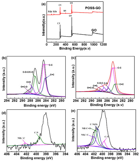 (a) X-ray photoelectron spectroscopy (XPS) survey peak of GO and POSS-GO, high resolution C1 spectra of (b) GO and (c) POSS-GO. High resolution N1 spectra of (d) POSS-NH2 and (e) POSS-GO.