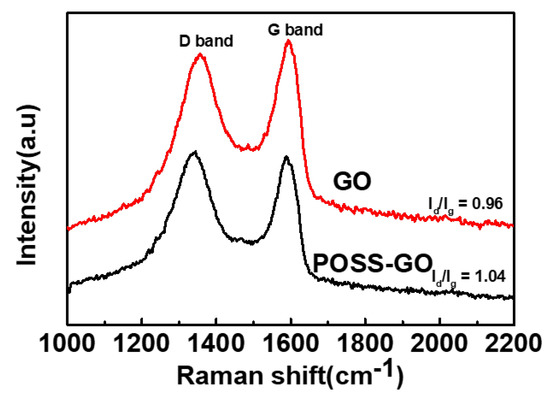 Raman spectra analysis of GO and POSS-GO, with Id/Ig ratio values representing the extent of functionalization of GO using POSS.