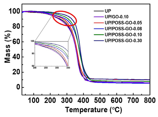 3.2. Thermal Properties of UP/POSS-GO Nanocomposites