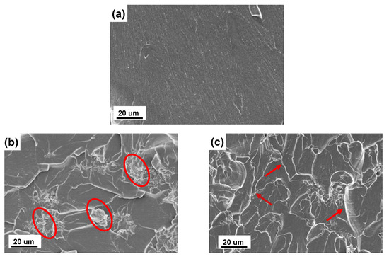SEM analysis of the fractured surfaces of the UP and UP/POSS-GO nanocomposites was conducted to examine the scrupulous dispersion of POSS-GO within the UP matrix. The SEM image of the fractured surface of UPexhibits smooth surface and there appears to be very tiny cracks which are too small to be visible, while SEM images of UP/POSS-GO nanocomposites possess cracks on the surface with the presence of nanofillers within the polymer matrix. Figure 9b presents a rough surface structure morphology with few protruding POSS-GO particles, as marked with a red circle. The particles extending onto the surface of UP prevail due to the presence of POSS-GO aggregates in the polymer, creating improper dispersion of nanofiller within the polymer at low concentration of 0.05 wt% [59]. The roughening of the polymer surface occurs with the addition of POSS-GO and the crack-propagation during fracturing of the surface is constrained. This notion is coherent with the mechanical property enhancement of the nanocomposites with the initiation of crack pinning and crack deflection mechanism. Figure 9c exhibited a better dispersion of POSS-GO into the UP matrix with the increase in wt% (0.10 POSS-GO). The red arrow marks in Figure 9c denoted the crack propagation with miniscule bulged-out POSS-GO particles. It provides clear evidence of astrong tendency of POSS-GO to interact with the polymer matrix and influencethe comprehensive properties of nanocomposites.