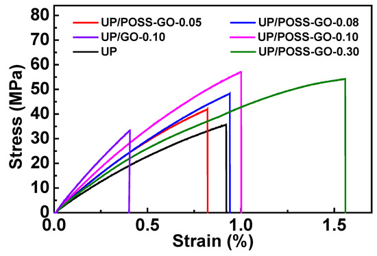 The mechanical properties’ analysis of the nanocomposites, in terms of tensile strength measurement, was executed with different wt% of POSS-GO within UP matrix, as shown in Figure 10. The tensile strength of UP ameliorated considerably with the incorporation of POSS-GO. The logic behind the tensile strength enhancement of nanocomposites relies on the thorough exfoliation of GO using POSS, enabling their synergistic effect on the local stress concentration for potent load transfer from polymer matrix to nanofillers. The auxiliary rationale relies on the covalent modification of GO using POSS and their immaculate interaction with the UP matrix. The UP/GO nanocomposite displays no improvement in the tensile strength and elongation at break (%), vindicating the poor interaction of pristine GO with the UP matrix. The incorporation of POSS-GO into the UP matrix via in situ polymerization imparts superior reinforcement efficiency than pristine GO. The tensile strength values tend to decrease with the addition of 0.30 POSS-GO into UP matrix which could be ascribed to the agglomeration of POSS-GO above the critical concentration. It influences the inclusive strength of the polymer with sporadic local stress concentration induced by the clustering of the POSS-GO particles. The tensile strength of UP/0.10 POSS-GO was boosted by 61.90% with respect to pure UP, verifying the conclusion from the SEM images outputs (Figure 9c). The increasing trend in elongation at break (%) values for UP with wt% ranging from 0.08 POSS-GO to 0.30 POSS-GO apparently conceives the role of the nanofiller in augmenting the maximum stress endurance of the polymer. The collegial effect of POSS and GO has ceased the polymer chain mobility which inflates the elongation at break (%) values with the increase in concentration of POSS-GO.