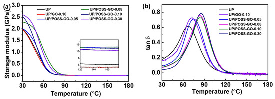 Dynamic mechanical analysis (DMA) outputs for (a) storage modulus of UP, UP/GO and UP/POSS-GO and (b) tan δ representation for UP, UP/GO and UP/POSS-GO. The inset in (a) demonstrates storage modulus at high temperature (120 °C up to 180 °C) for the nanocomposites.