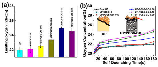 (a)LOI values of UP, UP/GO and UP/POSS-GO nanocomposites. (b) Oxygen concentration (%) values with different self-quenching time for the nanocomposites. The inset in (b) displays the synergistic effect of POSS-GO in retarding the flame. The red arrow represents the carbonaceous char produced due to the presence of POSS-GO, resisting the flame.