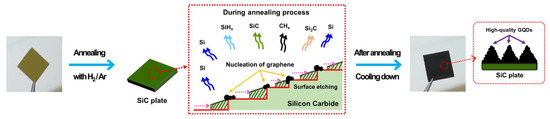 The schematic layout of the synthesis of high-quality graphene quantum dots (GQDs) by the hydrogen-assisted pyrolysis of silicon carbide (SiC).