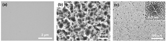 GQDs were prepared via the thermal decomposition of the SiC plates, as shown in Figure 1. The plates initially had flat surfaces, as shown in Figure 2a. However, when the plates were annealed at 1500 °C for 30 min in a vacuum furnace containing a gas mixture comprising Ar (96 at.%) and H (4 at.%), the morphology of the SiC surface was completely altered, dependent on the vacuum pressure, which was controlled by adjusting the flow rate of the gas mixture. At the vacuum pressure of 160 mTorr, irregularly shaped particulates of a few hundred nanometers in size were formed on the flat SiC surface, as can be seen in the FESEM image as shown in Figure S1b. Decreasing the pressure to 80 mTorr led to the flat surface being converted into a bumpy structure with a surface roughness of a few micrometers, and on this bumpy surface, a large number of nanoparticles were created, as shown in Figure 2b and Figure S1a. The nanoparticles were easily detached from the SiC plate by sonication in ethanol. The amount of GQDs detached from the SiC plate of 1cm × 1cm was about 200 μg. The TEM image shows that the nanoparticles were monodispersed with a size of 2.58 ± 0.31 nm, as shown in Figure 2c and Figure S2).