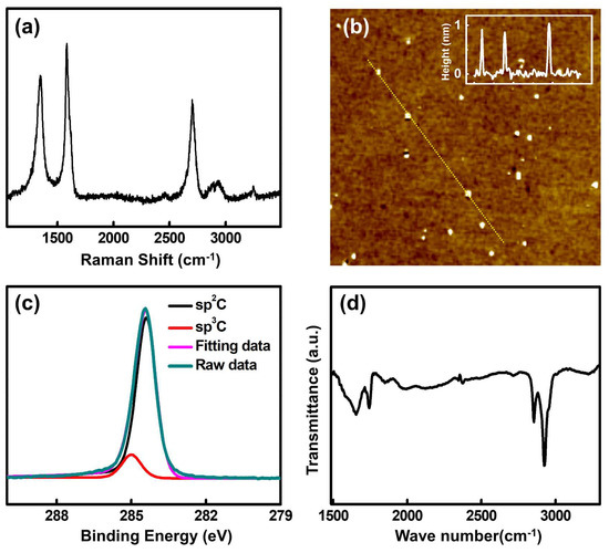 (a) The Raman spectra of the detached GQDs. (b) The atomic force microscope (AFM) image of the GQDs with the thickness graph of GQDs in yellow (the length of the yellow line inside the AFM image is 2.7 μm). (c) The X-ray photoelectron spectroscopy (XPS) high-resolution C1s spectrum and (d) the Fourier transform infrared (FT-IR) results of the GQDs.