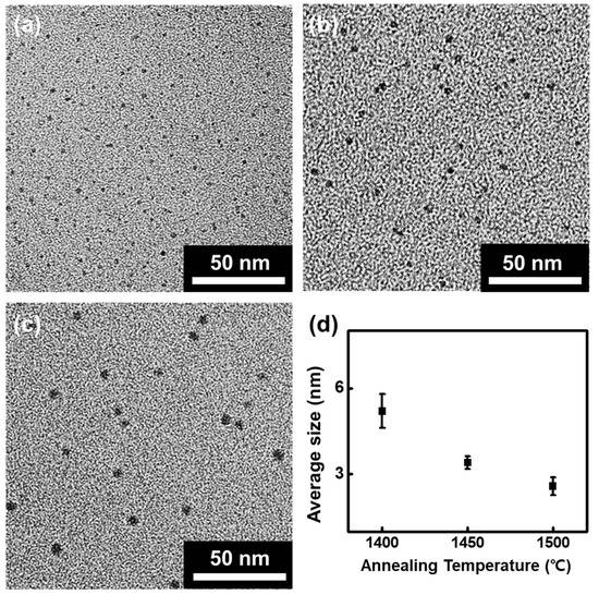 The HRTEM image of the GQDs fabricated on the SiC at a temperature of: (a) 1500 °C, (b) 1450 °C, (c) 1400 °C, (d) The correlation graph between the annealing temperature and the average size of the GQDs.