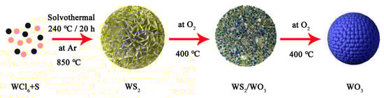 The preparation procedures of WS2, WS2/WO3 hybrids, and WO3 are illustrated in Figure 1. The WS2 microflowers were first synthesized by using a solvothermal method []. In general, WCl6 (0.894 g) was dissolved in NMP (70 mL), and this suspension was stirred for 10 min to obtain a dark brown solution. Next, sublimed sulfur was added into the mixture accompanied with an ultrasonic treatment for 20 min until a homogenous solution was formed. Subsequently, the solution was transferred into a 100 mL PolyPhenyLene-lined stainless steel autoclave and was heated at 240 °C for 20 h. After the solvothermal process, the black precipitates were collected and dried under vacuum at 100 °C for 12 h. The black powder was WS2 and was thereafter annealed at 850 °C for 2 h under argon atmosphere to increase the crystallinity.