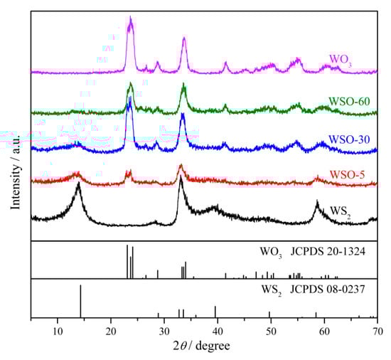 The crystalline information is demonstrated by XRD patterns (Figure 4). From the pattern of pure WS2, several broad peaks at 14.5°, 32.7°, 33.6°, 39.5°, and 58.4° are in good agreement with the (002), (100), (101), (103), and (110) planes of the hexagonal phase of WS2 (JCPDS Card No.08-0237) []. With the increase of the calcining time, the intensity of the (0 0 2) peak decreases gradually from WSO-5 to WOS-60. Simultaneously, the peaks at about 24.0° and 33.6°, which are ascribed to the (0 2 0) and (2 2 0) peaks of WO3, emerge and get strengthened. This phenomenon also suggests the successful construction of WS2/WO3 heterostructures. Moreover, pure WO3 was also analyzed, and it was found that WO3 possesses characteristic peaks at 23.1°, 23.8°, 24.1°, 33.6°, and 34.0°, corresponding to the crystal facets (001), (020), (200), (201), and (220) of WO3 (JCPDS Card No.20-1324) respectively [].