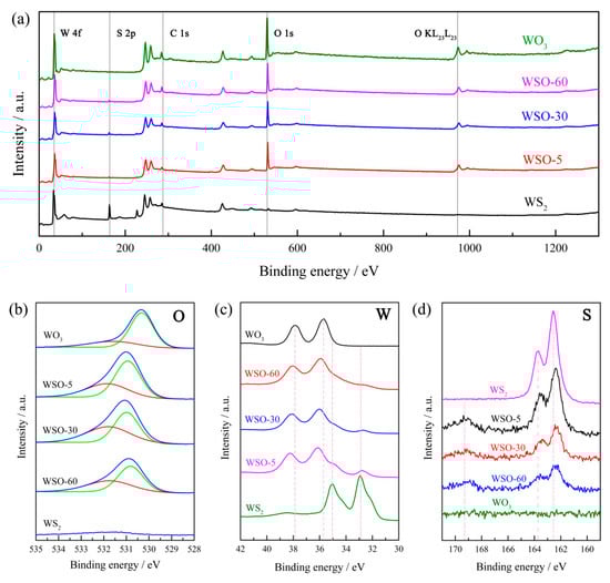 For the purpose of examining the chemical compositions and electronic states of elements of WSO-n, X-ray photoelectron spectroscopy (XPS) was further utilized in this work. It can be seen from the XPS full-range spectra (Figure 5a) that these obtained composites exhibit characteristic peaks of C, W, O, and S elements. The characteristic peak of C 1s situated at ~284.8 eV, ascribed to the contaminant carbon, was utilized to calibrate the XPS spectra. After the calibration, the corresponding narrow-range W 4f, S 2p, and O 1s spectra were discussed in detail. Figure 5b shows that the O 1s spectra of the WS2/WO3 heterostructures can be well fitted into two peaks at 530.94 eV and 531.94 eV, attributed to the O in WO3 and chemisorbed oxygen-containing materials, respectively [,]. As shown in Figure 5c, the two peaks of W 4f5/2 and W 4f7/2 of WS2 are situated at about 34.60 eV and 33.24 eV. After partial oxidation, new peaks at 37.99 eV and 35.96 eV appeared, which could be assigned to W 4f5/2 and W 4f7/2 in WO3 []. The characteristic peaks of both WS2 and WO3 can be clearly observed in WSO-n, which further confirms the successful synthesis of the aimed heterostructures. Ultimately, the S 2p spectra of these composites were characterized (Figure 5d). There are two binding energy of S 2p located at 162.30 eV and 163.70 eV, which can be assigned to the presence of S2− in WS2. The special peak present at 169.10 eV could be attributed to S6+ due to the oxidation of divalent sulfide ions []. Significantly, it only existed in WS2/WO3 hybrids. The characteristic peaks of S decreased gradually with the oxidation process due to the enhanced transformation from WS2 to WO3. Overall, all the XPS spectra results mentioned above demonstrated a successful construction of WS2/WO3 heterostructures.