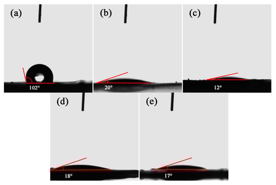 A contact angle analysis was adopted to assess the obtained materials’ wettability, which is traditionally determined by the substrates’ morphologies and chemical compositions [,]. Initially, the contact angle of pure WS2 was measured to be about 102° (Figure 6a). After oxidization, a sharp decrement of the contact angle values was observed with all values lower than 20° (Figure 6b–e), indicating the hydrophilicity of WS2/WO3 hybrids, and WO3 was dramatically promoted with the introduction of oxygen atoms. The increasing wettability might result from the formation of hydrogen bonds which are introduced by strong-polar oxygen atoms interacting with water molecules [,]. In addition, the high–magnification SEM images of WS2/WO3 hybrids (Figure 2c–e) shows that these heterostructures have rougher surface morphologies with voids and many highly water-permeable channels, which can further enhance the hydrophilicity.