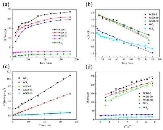 To explore the adsorption kinetics of these newly developed materials on RhB, the effect of the adsorption capacity over contact time was evaluated. As shown in Figure 7a, all the WS2/WO3 hybrid samples exhibited similar trends, with the sorption capacities increasing rapidly during the first 100 min, then gradually reaching equilibrium with a further increase of the adsorption time. Obviously, the pure WS2 showed a poor adsorption capacity of merely 16.4 mg/g, which can be ascribed to the hydrophobic surface property. After the introduction of oxygen atoms with a short duration time of 5 min, the adsorption capacity got a tremendous promotion (237.1 mg/g) due to the stronger hydrophilicity, as well as to the retention of the superior properties of WS2. However, with the further increment of the oxidation duration, the adsorption capacity gradually declined until reaching pure WO3, which exhibited a low adsorption performance of 30.1 mg/g.